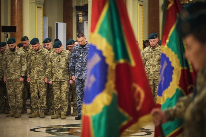 По случаю Дня пограничника президент Владимир Зеленский встретился с воинами Государственной пограничной службы Украины, отметил их государственными наградами, присвоил высшие офицерские звания и вручил командирам подразделений ленты почетного знака отличия "За мужество и отвагу".