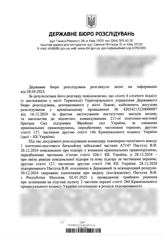 Дословно из ответа на запрос: "28 декабря 2024 подозреваемого Пастуха В.В. объявлен в государственный и международный розыск. 30.12.2024 направлено ходатайство о выдаче (экстрадиции) Пастуха В.В. из Республики Молдова. 02.01.2025 в производстве принято решение о приостановлении на основании пункта 2 части первой статьи 280 Уголовного процессуального кодекса Украины (объявлен в розыск подозреваемого)".