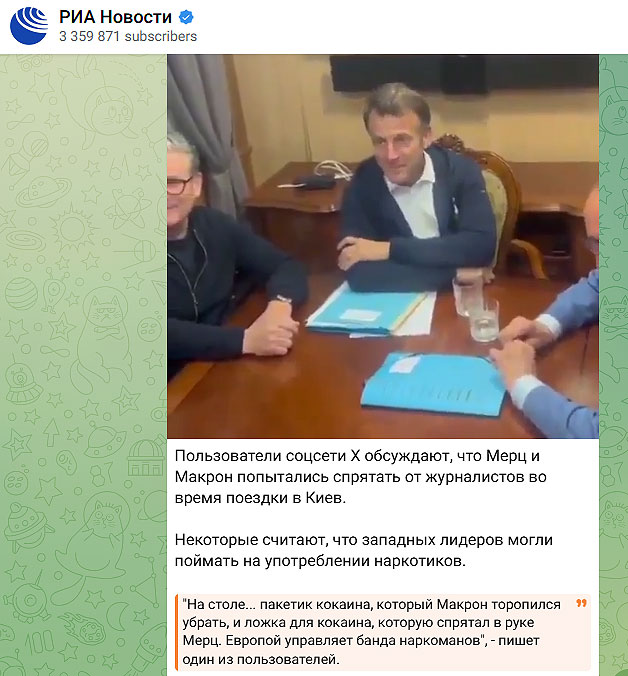 В Офисе президента Франции отреагировали на фейк, который распространяли российские пропагандисты о якобы употреблении европейскими лидерами наркотиков в поезде "Укрзализныци" по дороге в Киев, подчеркнув, что "пакетик с кокаином", который привиделся россиянам, на самом деле был салфеткой, которой пользовался Эмманюэль Макрон.