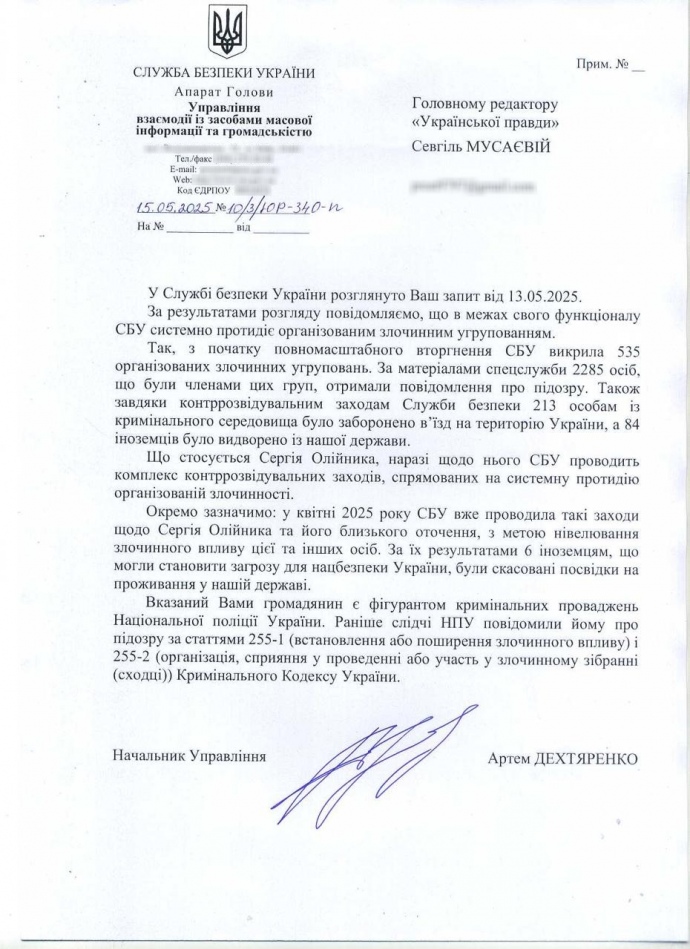 По данным СБУ, в апреле 2025 года уже проводились мероприятия для нейтрализации влияния Олейника и его ближайшего окружения.