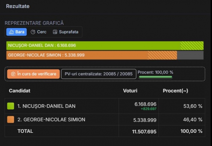 Детали: После обработки 100% протоколов с избирательных участков во втором туре победу одержал Никушор Дан - у него 53,6% голосов. Джордже Симион имеет 46,4%.