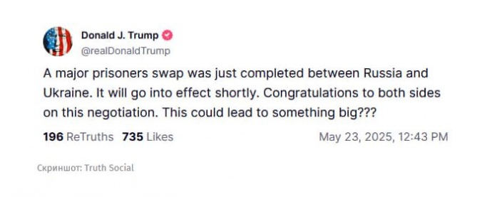 Источник: Трамп в Truth Social в пятницу, 23 мая, передает "Европейская правда"
