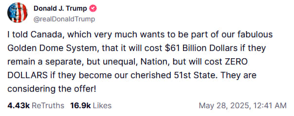 "Я сказал Канаде, которая очень хочет стать частью нашей замечательной Системы Золотого Купола, что это будет стоить 61 млрд долларов, если она останется отдельной, но неравноправной нацией. Но это будет стоить НОЛЬ ДОЛЛАРОВ, если она станет нашим любимым 51-м штатом", – написал американский президент.