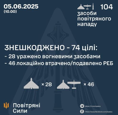 В ночь на 5 июня Россия атаковала Украину 103-мя ударными БПЛА типа Shahed и беспилотниками-имитаторами различных типов, ПВО уничтожила 74 вражеских дрона, 46 БПЛА - локально потеряны.