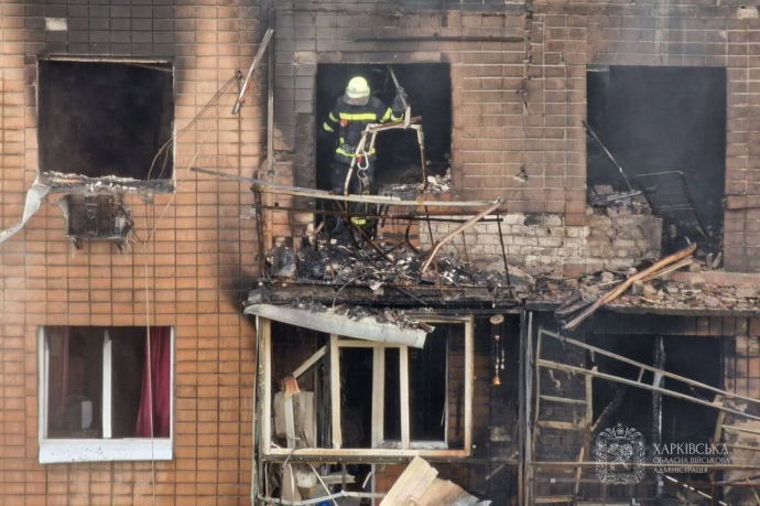 Прямая речь Терехова: "По предварительным данным, в результате террористического обстрела Харькова на данный момент зафиксировано повреждение 18 многоквартирных домов (в трех из них повреждены конструкции) и 13 частных домовладений".