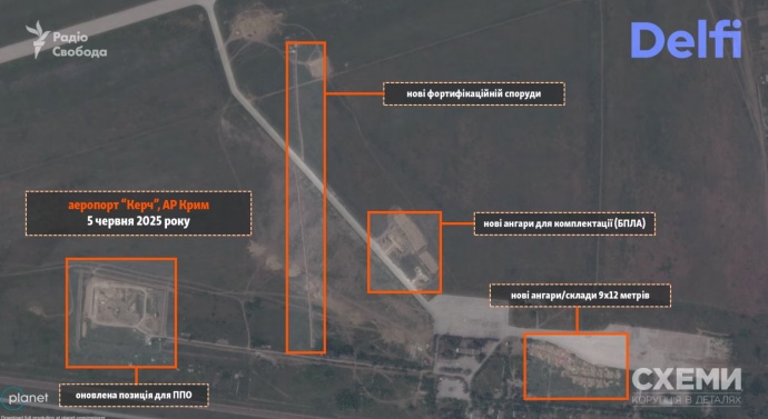 На спутниковых снимках, сделанных в феврале и июне 2025 года, видно строительство новых сооружений - в том числе защитных и маскировочных конструкций вокруг взлётной полосы. Снимки Planet Labs указывают на то, что переоборудование аэропорта "Керчь" продолжается до сих пор.