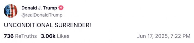 В конце концов Трамп потребовал от Ирана "БЕСЗОГОВОРОЧНОЙ КАПИТУЛЯЦИИ!" (авторская орфография сохранена. – Ред.).