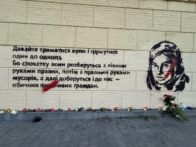 На Почтовой площади в Киеве восстановили мурал с цитатой Екатерины Гандзюк, который неизвестные перед тем зарисовали.