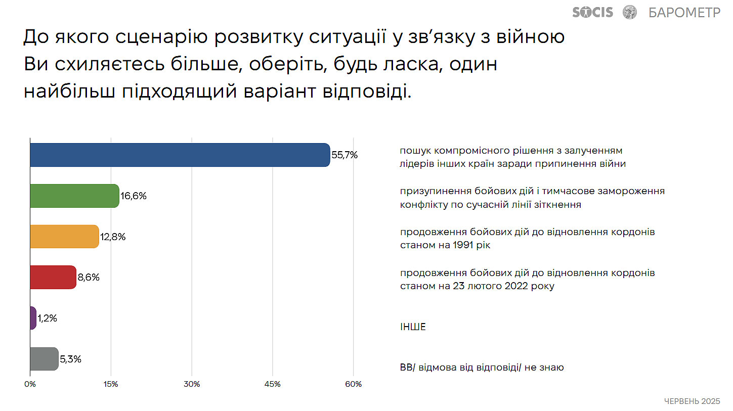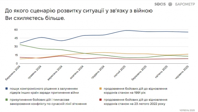 Детали: Согласно исследованию, 55,7% украинцев выступают за поиск компромиссного решения для прекращения войны, 16,6% согласны на приостановление боевых действий и временное замораживание конфликта по нынешней линии соприкосновения.