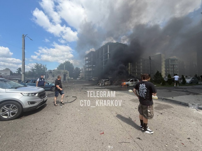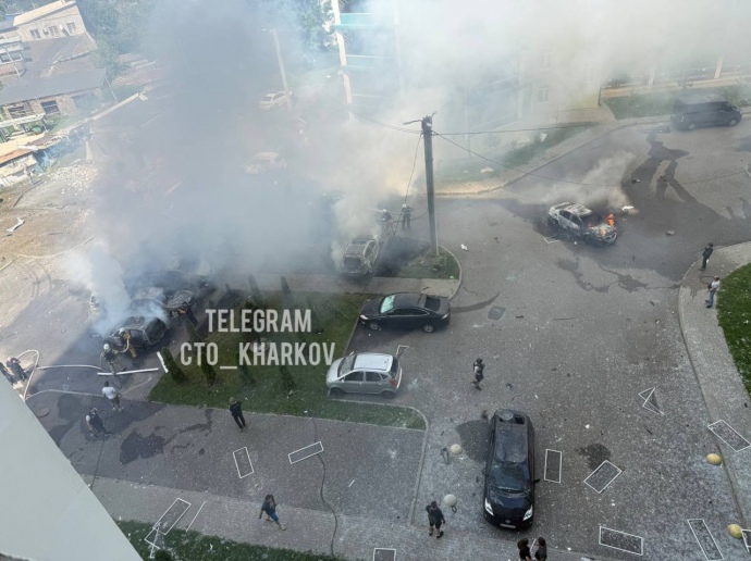 Чуть позже он уточнил, что попадание было рядом с многоэтажным домом. На месте горят около 15 автомобилей.