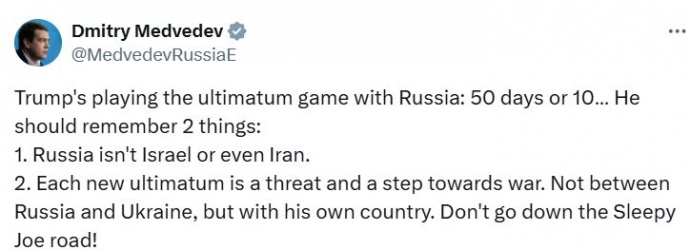 Детали: По словам Медведева, Трамп "играет в игру ультиматумов с Россией" и должен помнить, что РФ – "это не Израиль и даже не Иран".