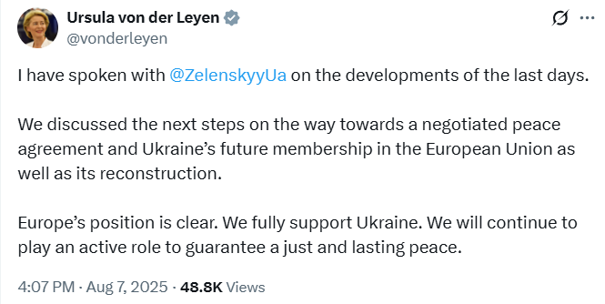 - Урсула фон дер Ляйен не участвовала в разговоре с Трампом о встрече с Путиным, но ее проинформировали о ее ходе и результатах лидеры ЕС.
