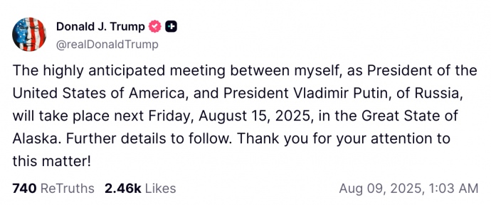 Прямая речь: "Долгожданная встреча между мной, как президентом США, и лидером России Владимиром Путиным состоится в следующую пятницу, 15 августа 2025 года, в великом штате Аляска. Дальнейшие подробности будут сообщены позже. Спасибо за внимание к этому вопросу!"