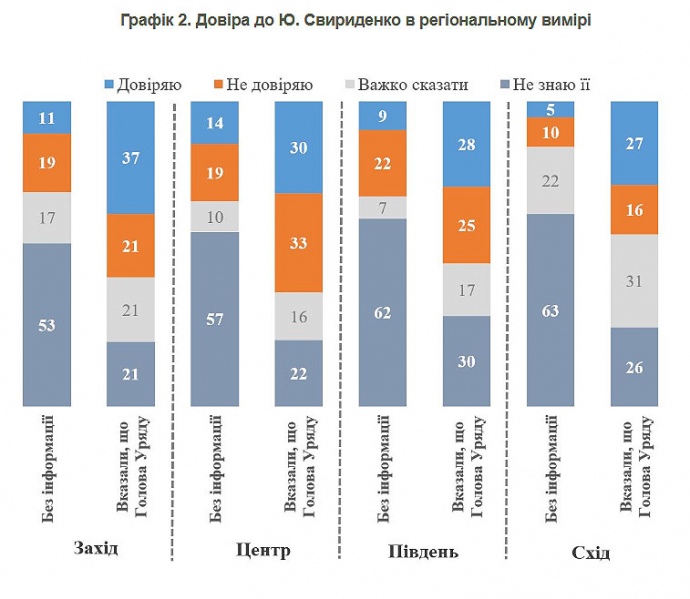 КМИС отмечает, что во всех регионах прослеживается тенденция, что не более половины знают Свириденко, если не указывать ее новую должность (и среди тех, кто знает, чаще респонденты говорили, что не доверяют ей, чем доверяют).