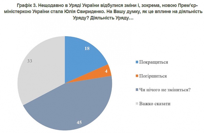Около половины респондентов (45%) считают, что после назначения Свириденко премьер-министром деятельность правительства не изменится, а еще 33% не смогли сформулировать своих ожиданий.