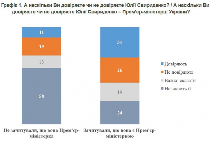 "Если в обоих случаях пересчитать уровень доверия только среди тех, кто знает Ю. Свириденко, то в первом случае (когда мы не говорим, что она является премьер-министром) соотношение доверия и недоверия было 25% к 45% (остальные 30% имеют неопределенное отношение). А во втором случае соотношение доверия и недоверия будет уже 41% и 34% (остальные 25% имеют неопределенное отношение). Можно предположить, что когда мы не говорим респондентам, что Ю. Свириденко является руководителем правительства, то даже среди тех 42%, которые якобы ее знают, не все действительно поняли, о ком идет речь", – пояснили социологи.