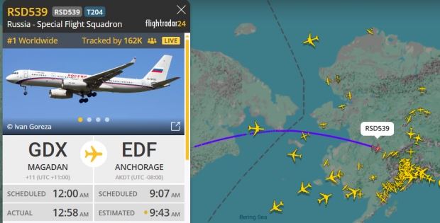 Детали: Самолет главы Кремля, который по дороге из западной части России останавливался в Магадане на крайнем востоке страны, приземлился в Анкоридже на Аляске.