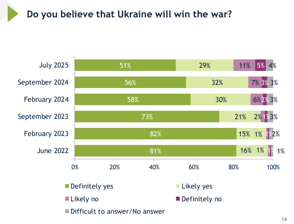 Большинство опрошенных граждан Украины считают, что война закончится в течение 1-2 лет, при этом 80% однозначно или скорее верят в победу.