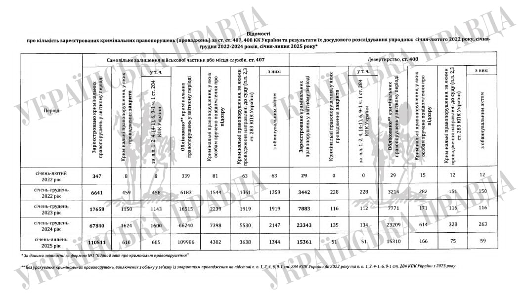 Что касается статьи 408 УК (Дезертирство), то с 2022 года по июль 2025 года зарегистрировано суммарно 50 058 уголовных производств по этой статье, в 1248 производствах сообщено о подозрении.