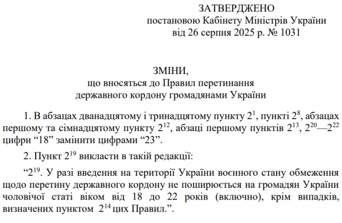 Постановление о внесении изменений в Правила пересечения государственной границы гражданами Украины, которое разрешает выезд из Украины мужчинам в возрасте от 18 до 22 лет включительно, обнародовано на правительственном портале.