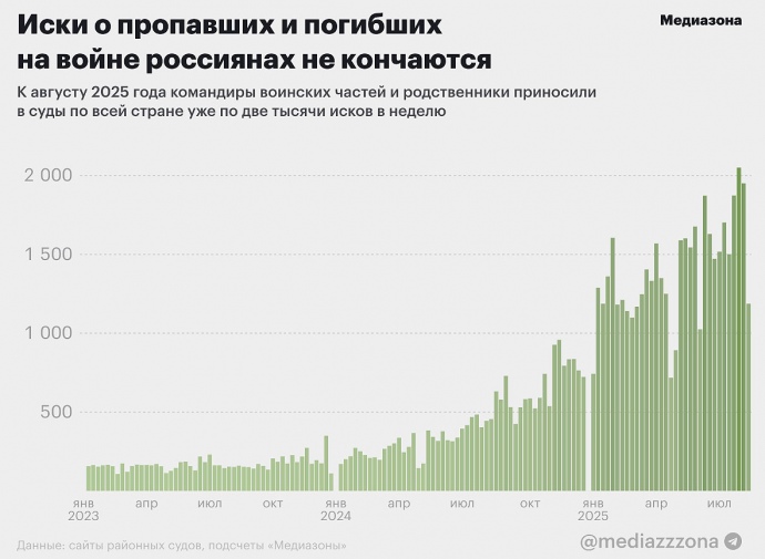 "До второй половины 2024 года этих исков в судах почти не было — а значит, значительную долю пропавших без вести (кроме тех, чьи тела были обменяны) мы никак не учитывали, так как не видели их ни в некрологах, ни в реестре наследственных дел. Формально эти люди вообще не считались погибшими", – отмечает "Медиазона".