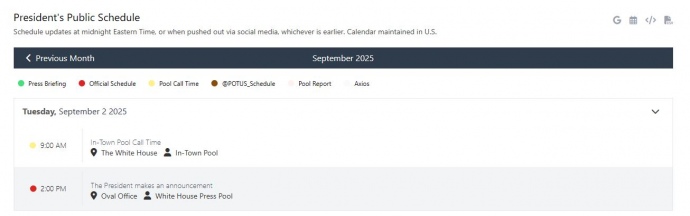Президент США Дональд Трамп, согласно расписанию, выступит с новым заявлением из Овального кабинета Белого дома во вторник, 2 сентября.