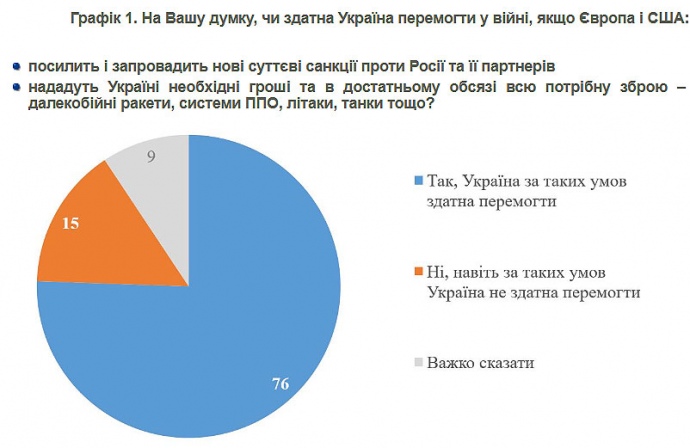 Дословно социологи: "Абсолютное большинство украинцев – 76% – верят в возможность победы в войне, если Украина будет должным образом поддержана санкционной политикой и получит достаточно оружия и денег. Считают, что даже при таких условиях Украина не способна победить – 15%. Остальные 9% не смогли определиться со своим мнением".