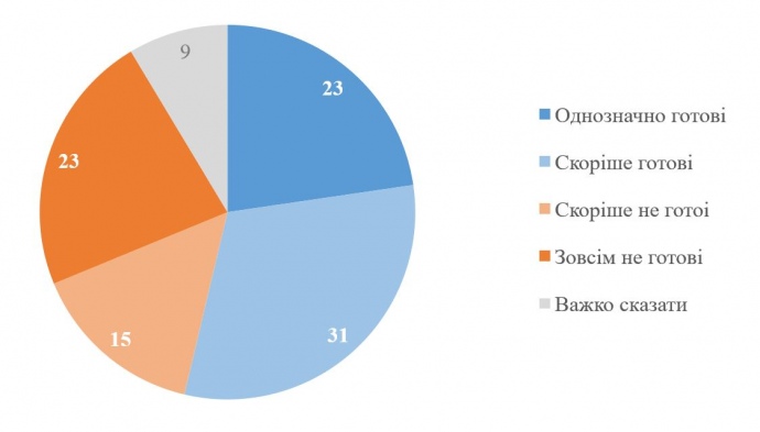 Детали: Отмечается, что среди украинцев (и мужчин, и женщин в возрасте 18+ лет, не проходящих военную службу) 54% отвечают, что они скорее или однозначно готовы в случае необходимости присоединиться к Силам обороны и с оружием в руках защищать Украину. Из них 23% однозначно готовы, а еще 31% скорее готовы.
