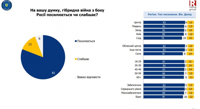 Детали: Результаты опроса показывают, что большинство украинцев (81%) считают, что гибридные угрозы со стороны России для Украины усиливаются.