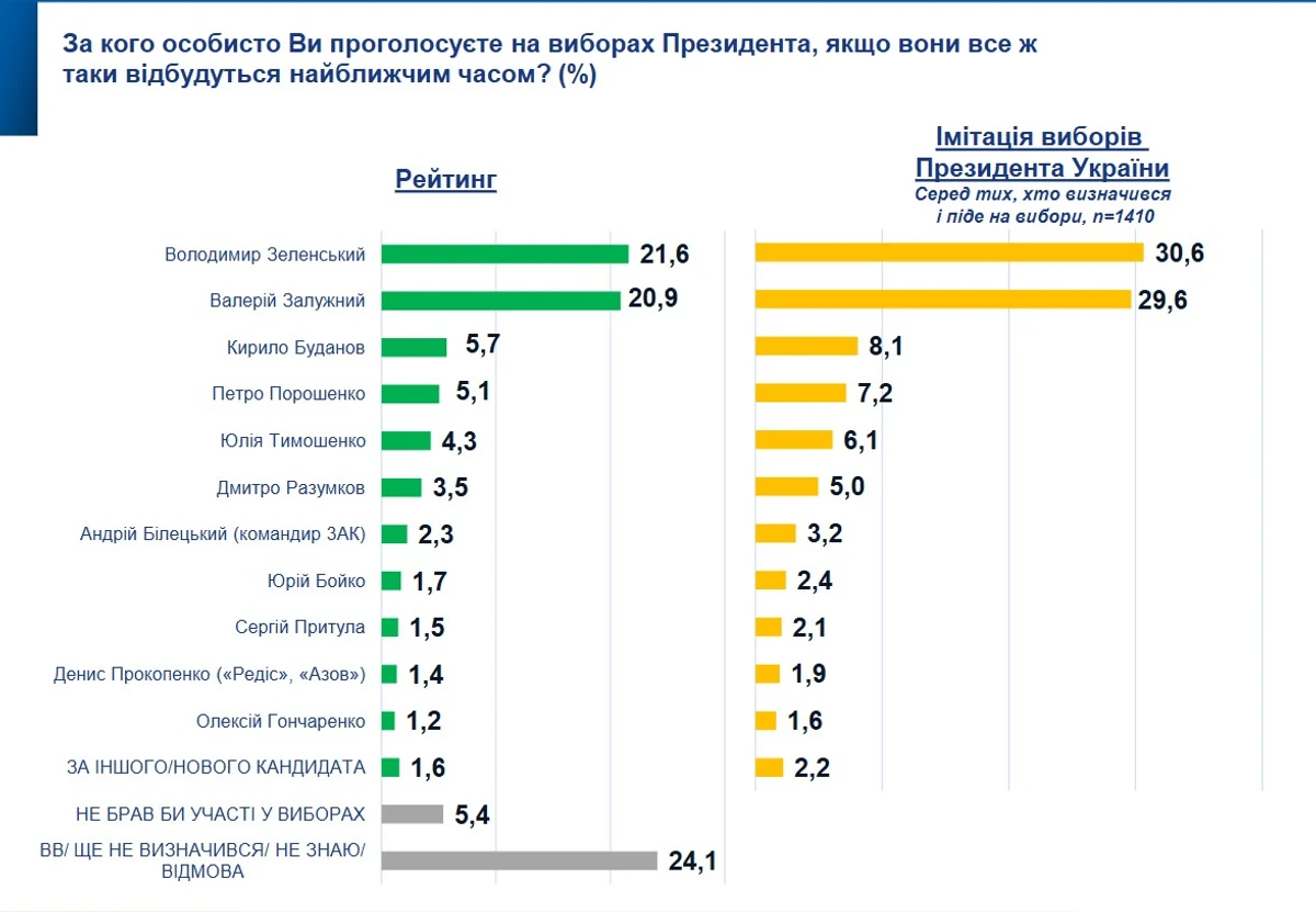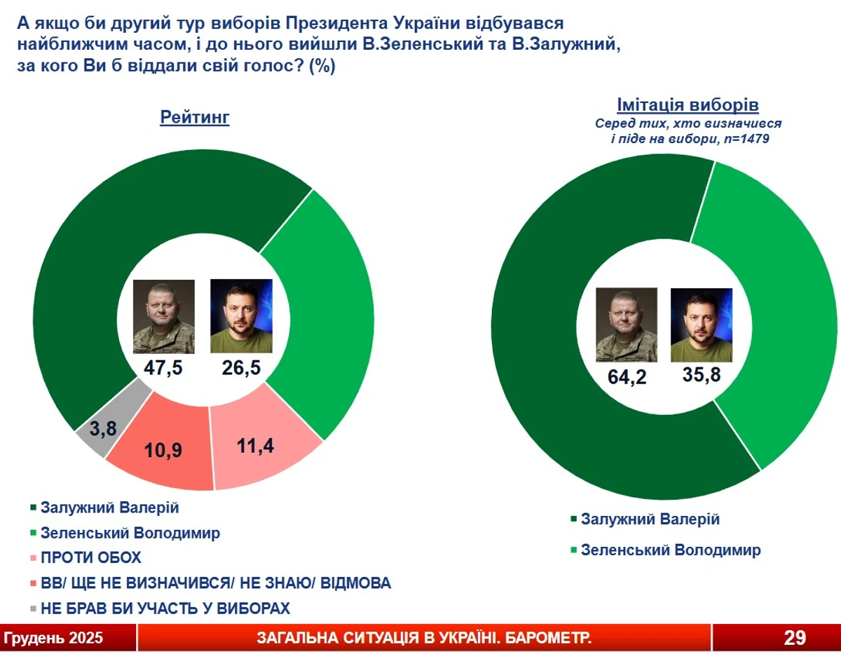 Если бы президентские выборы состоялись в ближайшее время и в них участвовали нынешний посол Украины в Британии генерал Валерий Залужный и президент Владимир Зеленский, то они оба прошли бы во второй тур.