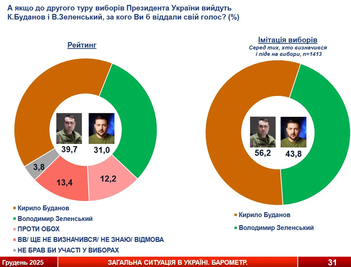 Во втором туре уверенное преимущество сохраняет Залужный с результатом 64% против 36% у Зеленского. Если Залужный не будет участвовать в президентских выборах, то на второй тур вероятно вместе с Зеленским попадет руководитель ГУР Кирилл Буданов. В таком случае победил бы Буданов (56%) против 44% у Зеленского.