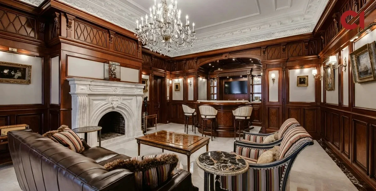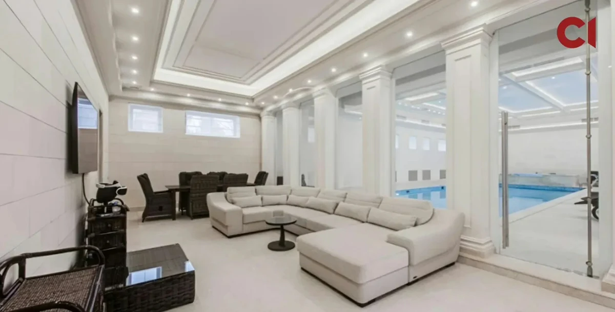 На втором — три спальни с санузлами, кабинет, библиотека, гостиная, сауна, душевая, комната, бар, две гардеробные, два санузла, две спальни, гостиная с камином, пять гардеробных и две ванные комнаты. Отмечается, что в доме есть лифт, скрытая система видеонаблюдения. На территории – гараж на пять автомобилей и парковка еще для пяти авто.