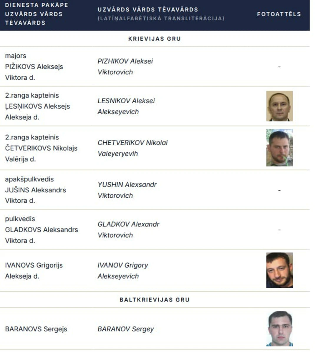 В этом документе раскрыли имена шести сотрудников бывшего ГРУ (сейчас – Главное управление Генерального штаба ВС РФ), а также одного сотрудника идентичной белорусской службы, которые шпионили против Латвии.