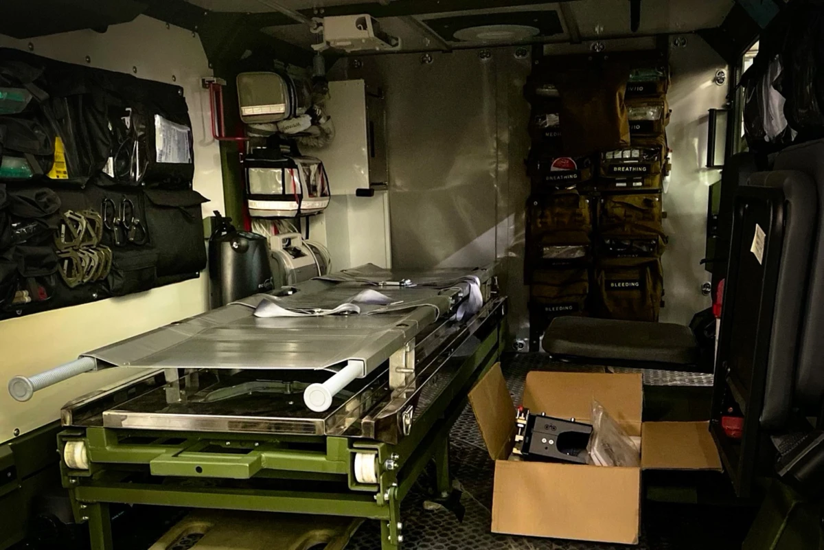Как свидетельствуют фото, внутри машина оснащена необходимым оборудованием для полноценного оказания помощи на этом этапе эвакуации раненого. Снаружи авто дополнительно закрыто каркасом с натянутой сеткой, которая является защитой от мелких вражеских беспилотников.