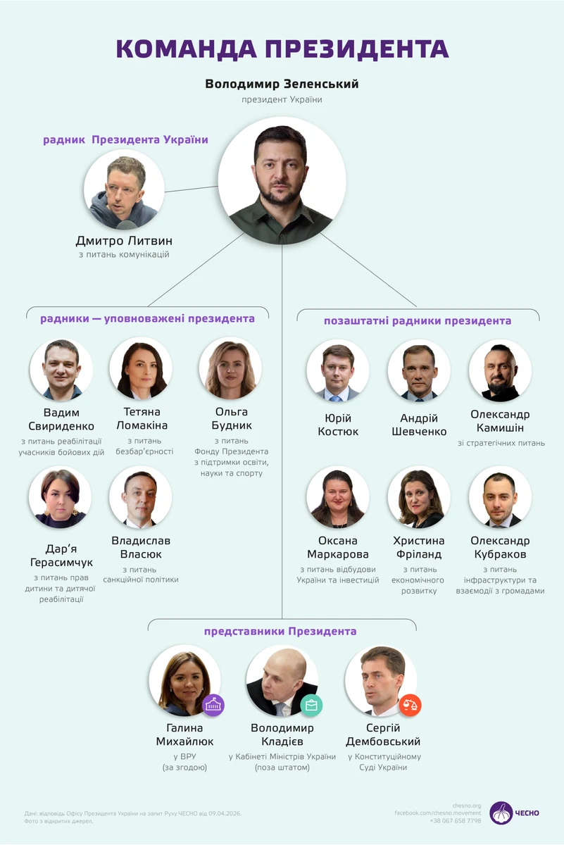 "Движение Честно" в ответ на информационный запрос получило от Офиса президента обновленный список фамилий советников и представителей президента Владимира Зеленского, а также фамилии тех, кто входит в команду Кирилла Буданова, который возглавил ОП после отставки Андрея Ермака.
