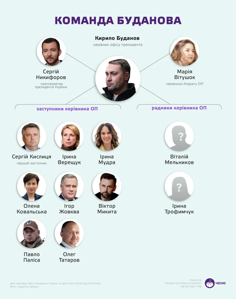 "Кирилл Буданов заметно обновил свою команду. В отличие от предыдущего состава, в Офисе отсутствуют внештатные советники, а вместо четырех советниц Андрея Ермака теперь есть только двое — Виталий Мельников и Ирина Трофимчук. Примечательно, что в открытых источниках информация о них отсутствует", - указывает "Движение Чесно".