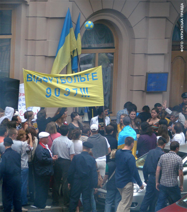 В руках у протестувальників - футбольні атрибути: м'ячі, дудки, а також барабани.