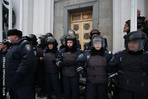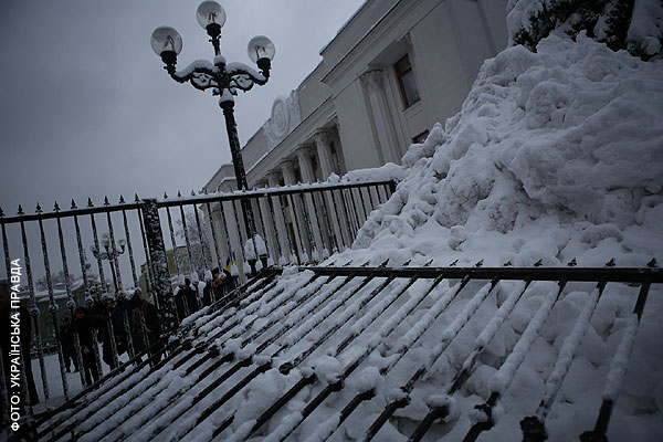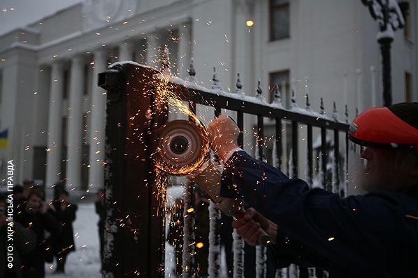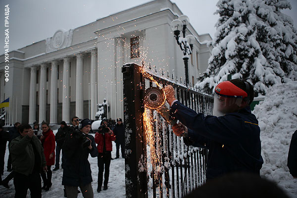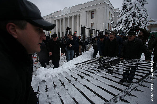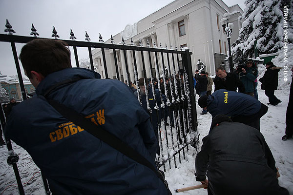 За первые полдня работы новой Верховной Рады представители ВО "Свобода" успели спилить забор вокруг Верховной Рады и выбить дверь одного из подъездов парламента, а также вынести вместе с нею рамку металлоискателя.