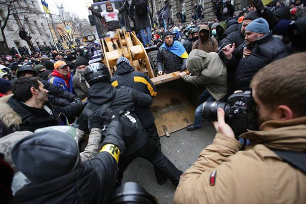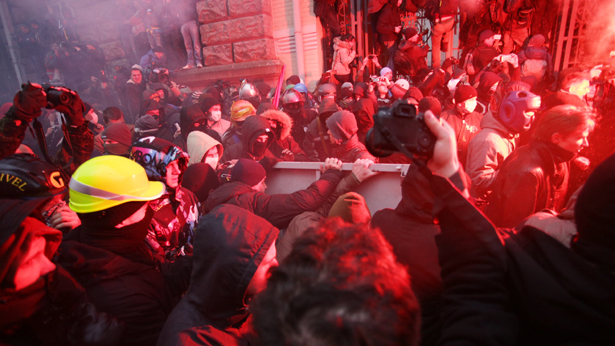 После многочисленных провокаций, когда "штурмовики" расшатывала оцепление, за которым стоял Беркут, били по ограждению дубинками, бросали свето-шумо-гранаты и распыляла газ, а также бросали камни по "Беркута", спецназовцы пошли в наступление и отогнали митингующих на угол с улицей Институтской.