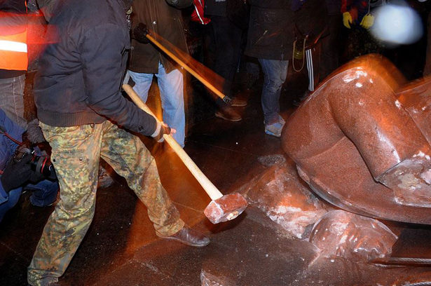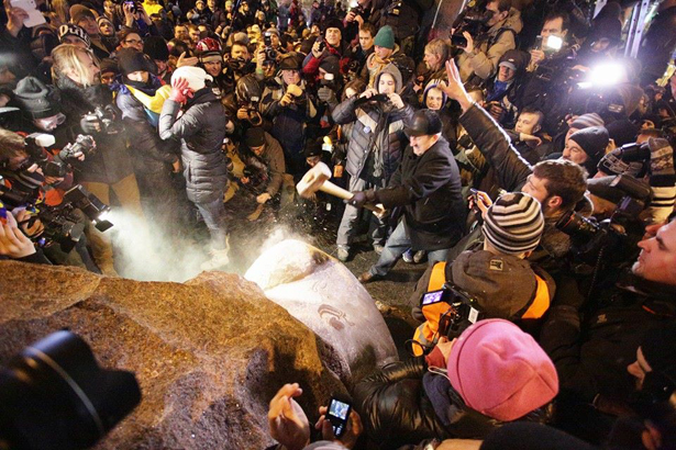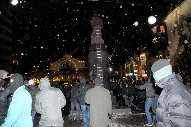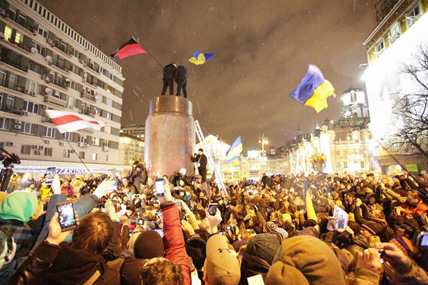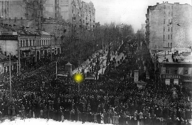 | До сооружения памятника Ленину на его месте был вход на бульвар. На этом снимке - демонстрация на углу улицы Крещатик и Бибиковского (ныне - Шевченко) бульвара в Киеве. Март 1917-го. Желтая точка - место, где в 1946-2013 годах стоял Ильич из красного гранита. Фото: Историческая Правда |