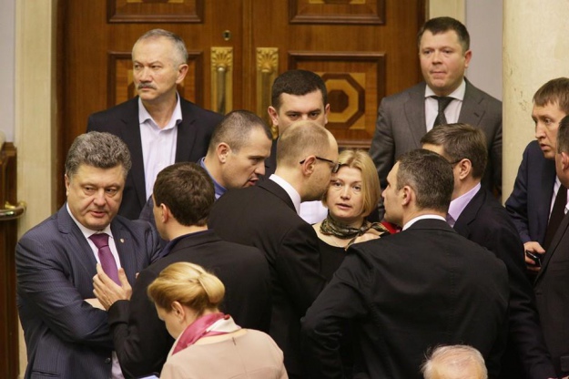 Верховная Рада с боем согласилась заслушать законопроекты Кабмина Яценюка по предотвращению финансовой катастрофы. Однако коммунисты и часть регионалов покинули сессионный зал во время выступления премьера.