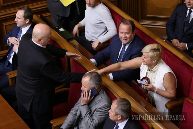 Секретарь СНБО Александр Турчинов радостно приветствует председателя НБУ Валерию Гонтареву